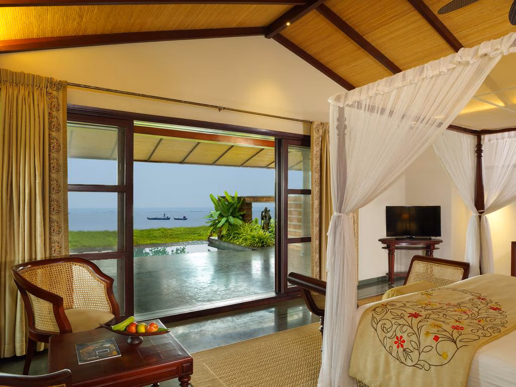 Located in Kumarakom on the shores of Kerala’s largest lake, the resort offers a serene backwater setting surrounded by lush greenery and calm waters. The peaceful lakefront environment provides privacy and exclusivity while still being accessible from Cochin.